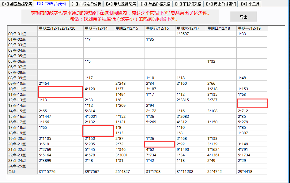 优化宝贝的下架环境,找出最有优势的时间下架!举个例子,如果你是一个三年级的小学生你会去找六年级同学的麻烦吗,但是如果碰到一年级的就不一样了你就NB了,同样的道理,你的宝贝都是和一些大咖或者比你强很多的宝贝一起下架,那么你肯定竞争不过人家,那么我们避开这些大咖呢 或者是找一些比我们更弱的宝贝一起下架是不是更好呢?相信很多同学都明白了,这就是下架时间的重要性,当然竞争是相对而言的,没有绝对的好时间,竞争随时都存在,我们的优化就是降低竞争度,就像上图显示,我们可以找到红框选中的时间空白点 相对来说 这个时间要比其他时间好的多!!