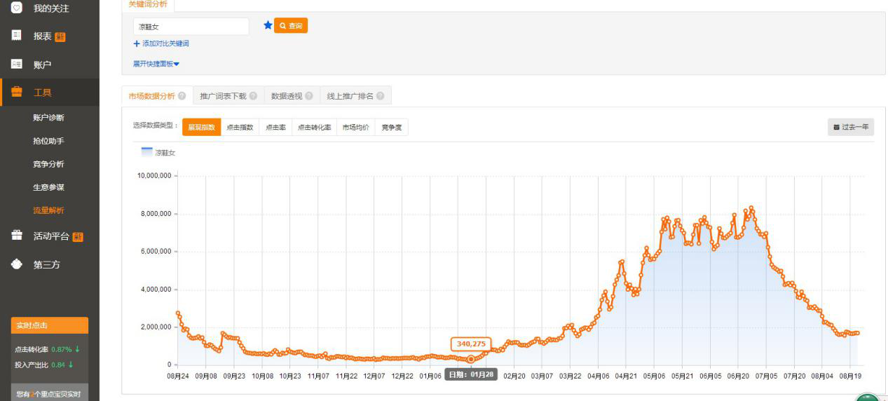 用凉鞋女为例。打开卖家中心的我要推广—淘宝直通车—流量解析输入凉鞋女,时间选择过去一年,我们会得到如图所示的一张数据图,